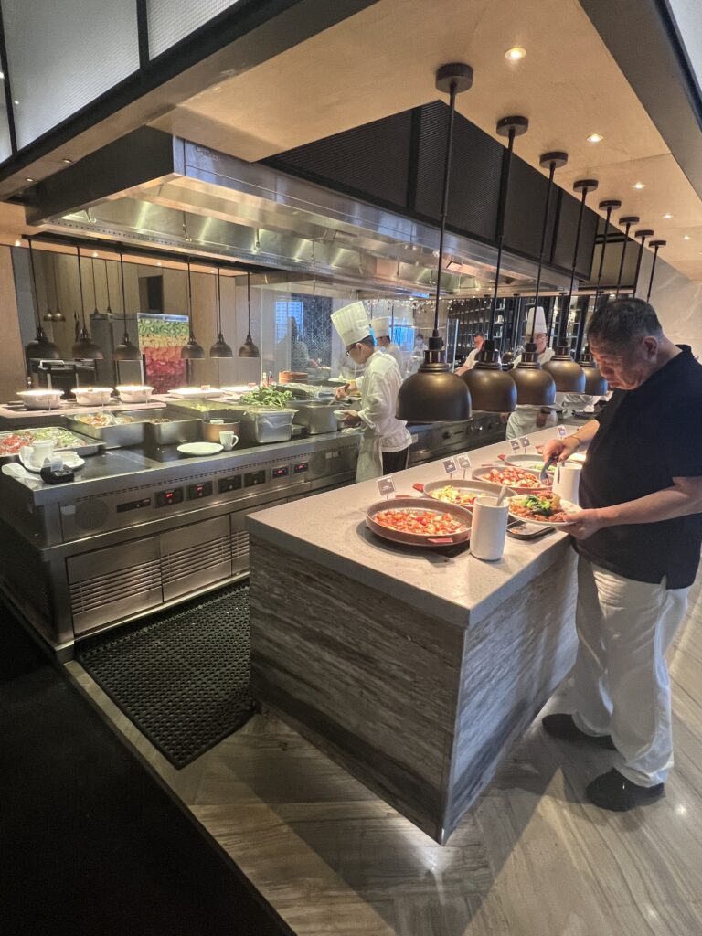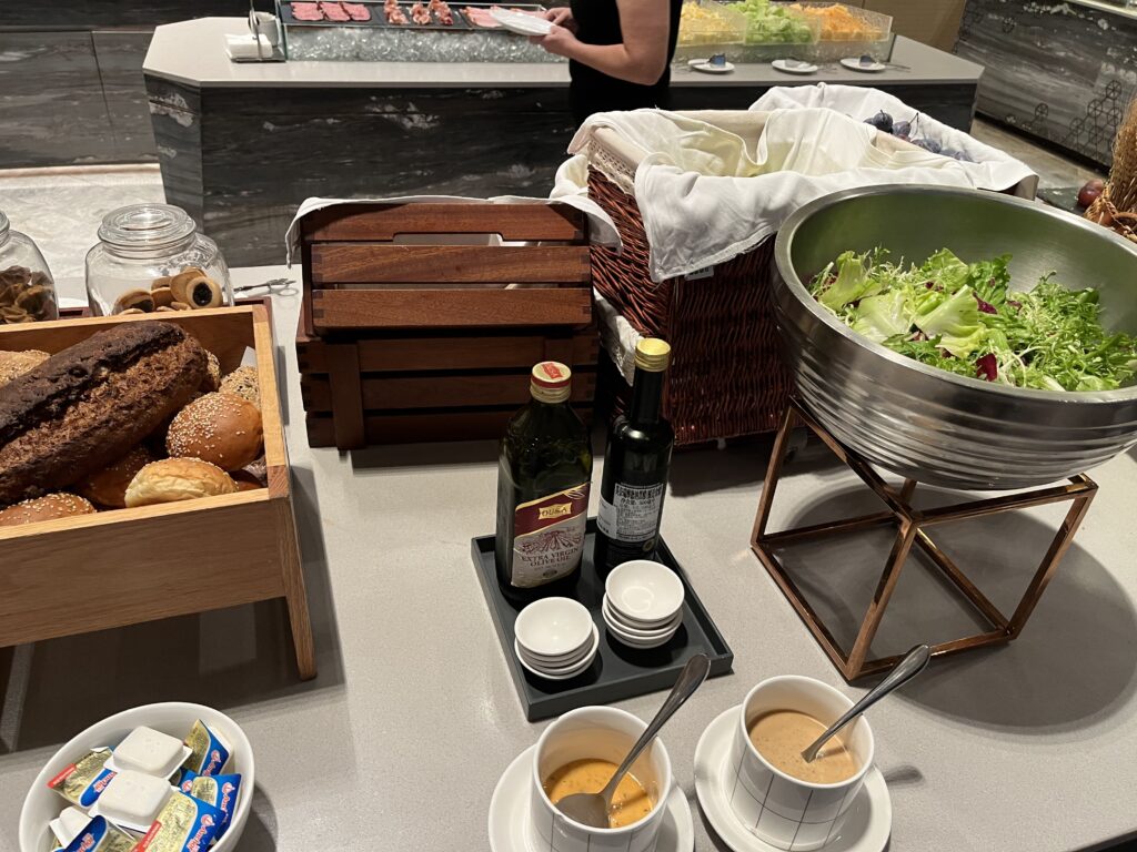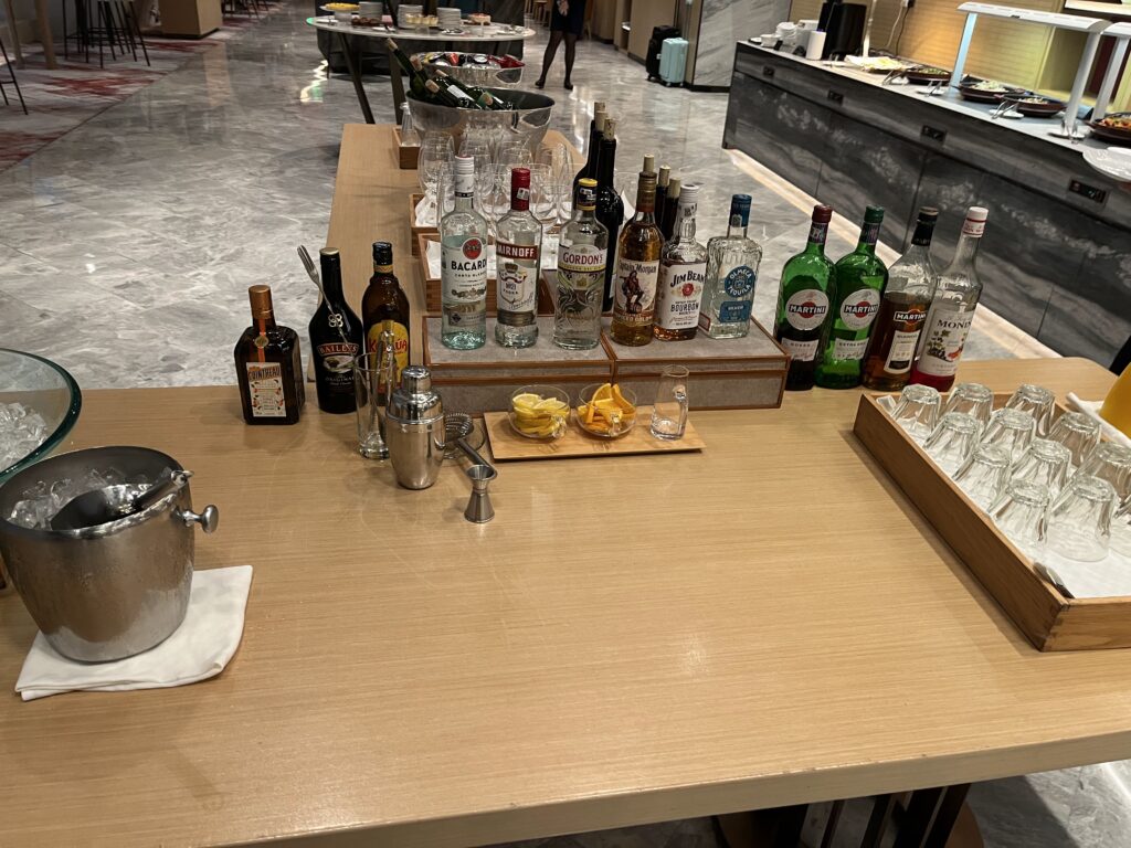 カクテルタイムは、サラダやハム、サーモンなどの軽食に加え、麺類のカウンターキッチンもありました。カクテルタイムのみアルコールも提供されます。