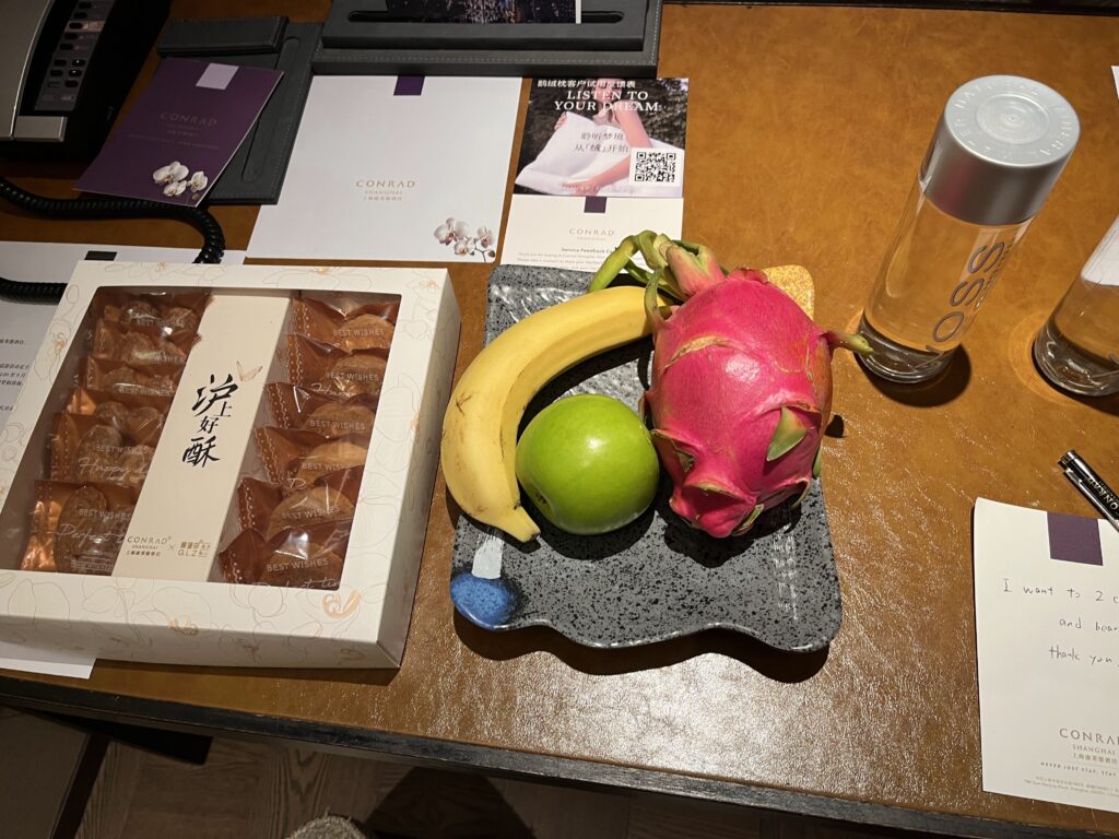 ヒルトンダイヤモンド会員特典なのか、フルーツと焼き菓子を準備されていました。見切れていますが水もペットボトルに加えてvossもあり水筒がわりに重宝しました。