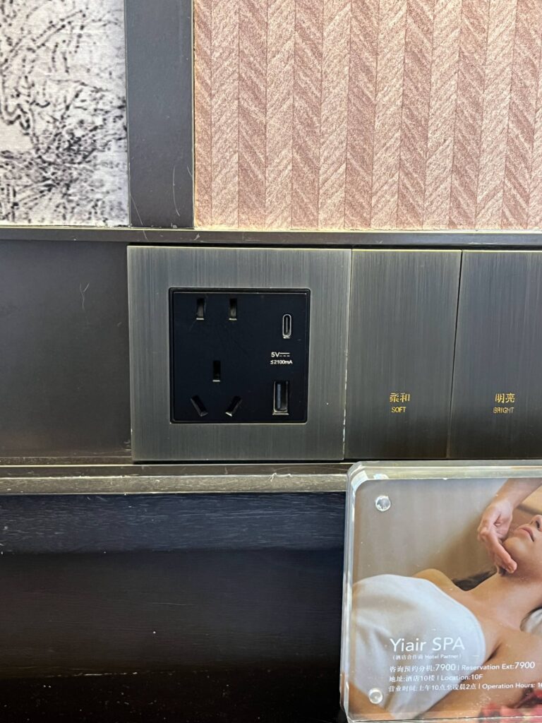 枕元の両サイドにコンセントとテーブルがあります。上海は日本と同じAタイプとOタイプが主流で、どちらもありました。変換器は不要ですし、タイプA、タイプCどちらもケーブルを差し込めるためユーティリティは文句なしです。